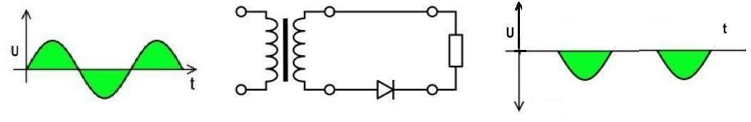Enkelzijdige gelijkrichting, met 1 diode, zonder condensator , alleen de onderste helft van de sinus blijft over.