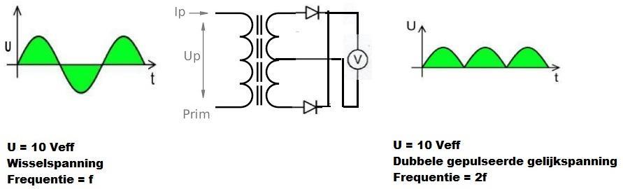 Dubbelzijdige gelijkrichting met een trafo met bruggelijkrichter, zonder condensator ,