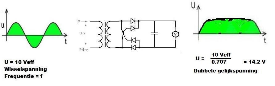 Dubbelzijdige gelijkrichting met een trafo met 4 diodes, met condensator , we hebben nu de gelijkspanning afgevlakt.