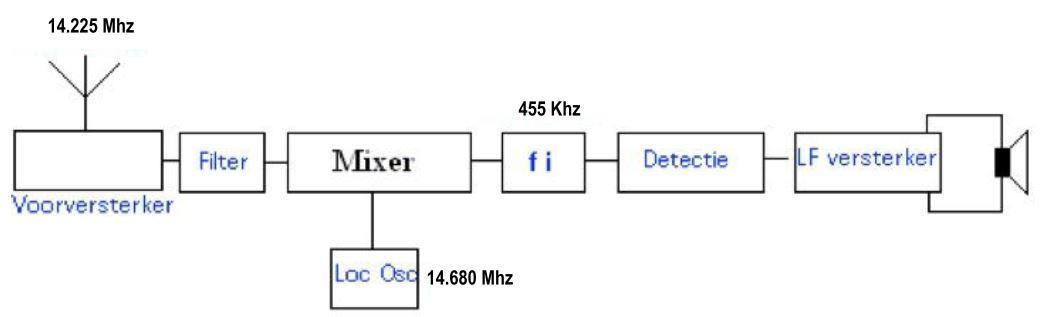 Nadeel: de spiegelfrequentie wordt ook ontvangen en het ligt aan de kwaliteit van het MF filter of deze spiegelfrequentie uitgefilterd wordt.