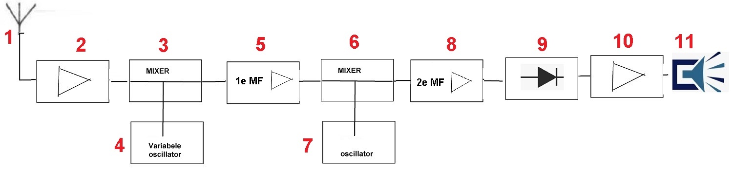 Bij een dubbelsuperheterodyne ontvanger zijn er niet één maar twee mixer/oscillator/filter trappen