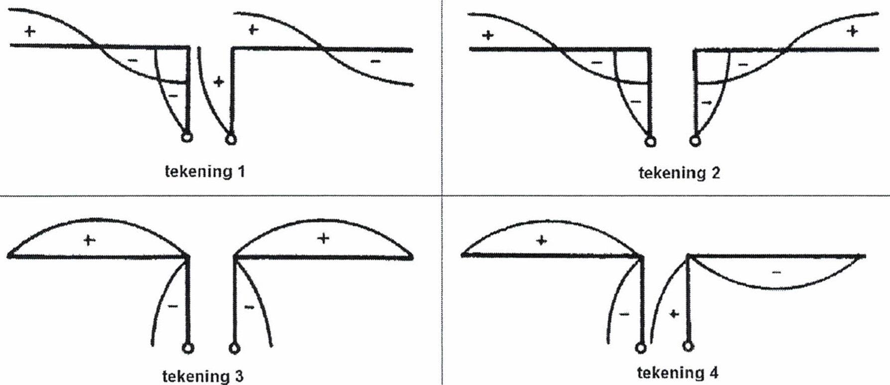 Welke tekening geeft de juiste spanningverdeling op straler en voedingslijn weer?