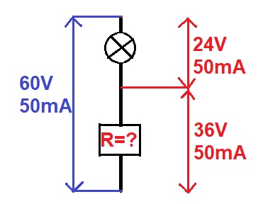 Een gloeilamp van 24 V en 50 mA wordt via een weerstand aangesloten op een spanning van 60 V.